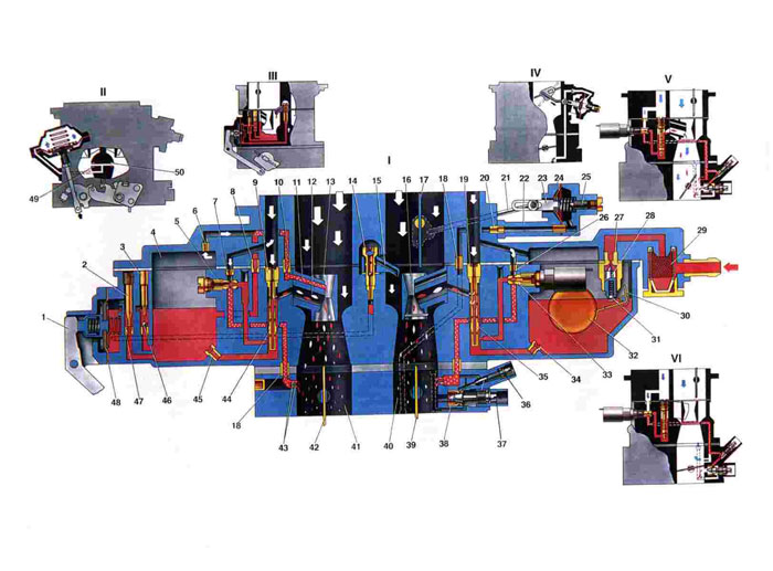 1. Рычаг ускорительного насоса. 2. Винт регулировки подачи топлива ускорительным накосим: 3. Пробка обратного клапана ускорительною насоса. 4. Поплавковая камера. 5. Топливный жиклер переходной системы второй камеры: 6. Воздушный жиклер экономайзера (эконосгата): 7. Воздушный жиклер переходной системы; 8. Топливный жиклер эконостата: 9. Главный воздушный жиклер второй камеры, 10. Эмульсионный жиклер эконостата; 11. Распылитель эконостата: 12. Распылитель главной дозирующей системы второй камеры; 13. Малый диффузор второй камеры; 14. Клапан распылителя ускорительного насоса: 15. Распылитель ускорительного насоса; 16. Малый диффузор первой камеры; 17. Воздушная заслонка; 18. Соединтельная втулка каналов карбюратора: 19. Главный воздушный жиклер первой камеры: 20. Воздушный жиклер пускового устройства: 21. Тяга. соединяющая рычаг оси воздушной заслонки с рейкой пускового устройства: 22. Корпус пускового устройства; 23. Рейка пусковою устройства; 24. Диафрагма пускового устройства: 25. Регулировочный винт пускового устройства: 26. Воздушный жиклер системы холостого хода: 27. Седло игольчатого клапана: 28. Игольчатый клапан; 29. Топливный фильтр; 30. Кронштейн поплавка с упором и язычком; 31. Шарик демпфера игольчатого клапана; 32. Поплавок; 33. Топливный жиклер системы холостого хода: 34. Главный топливный жиклер первой камеры: 35. Эмульсионная трубка первой камеры; 36. Регулировочный винт состава (качества) смеси холостого хода: 37. Регулировочный винт количества смеси холостою хода; 38. Седло регулировочного винта: 39. Дроссельная заслонка первой камеры: 40. Первая смесительная камера; 41. Вторая смесительная камера: 42. Дроссельная заслонка второй камеры; 43. Нерегулируемые отверстия переходной системы: 44. Эмульсионная трубка второй камеры: 45. Главный топливный жиклер второй камеры: 46. Обратный клапан ускорительного насоса: 47. Перепускной жиклер ускорительного насоса: 48. Диафрагма ускорительного насоса: 49. Жиклер пневмопривода, расположенный во второй камере: 50. Жиклер пневмопривода, расположенный в первой камере; 51. 1.Схема работы двигателя: 52. 11.Схема работы камеры карбюратора на максимальной мощности пневмопривода дроссельной заслонки второй: 53. 111.Схема работы ускорительного насоса; 54. IV. Схема работы пускового устройства; 55. V. Схема работы карбюратора на режимах дросселирования; 56. VI. Схема работы карбюратора на холостом ходу. |