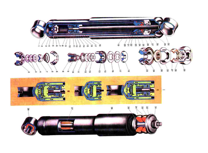 Амортизаторы передней и задней подвесок отлича- ются размерами, способом крепления верхней час- ти, наличием буфера 37 у переднего амортизато- ра, который ограничивает длину штока при ходе отдачи и тем самым предотвращает чрезмерное пе- ремещение вниз передних колес при движении по очень неровным дорогам. Кроме того, амортизато- ры отличаются параметрами рабочей характеристи- ки. Однако основные детали переднего амортиза- тора такие же, как и у заднего, поэтому в дальнейшем будет рассматриваться только задний амортизатор. Амортизатор состоит из следующих основных частей: резервуара с головкой 1, рабо- чего цилиндра 21, клапана сжатия и штока 20 в сборе с поршнем и клапанами, направляющей втул- кой 23, гайкой 29, уплотнителями и кожухом. Объемом для рабочей жидкости служит цилиндр 2-1 и резервуар 19, выполненные из трубы. В нижней части резервуара завальцовано дно, на которое опирается клапан сжатия. В верхней части резер- вуара нарезана резьба под гайку 29. Снаружи к дну резервуара приварена нижняя головка аморти- затора. Клапан сжатия состоит из корпуса 2. дисков 3 и 4, тарелки 7, пружины 5 и обоймы 6. Корпус клапана сжатия металлокерамический. В его верхней части проточено гнездо с фаской, перекрываемое дисками, которые поджимаются к гнезду пружиной 5 через тарелку 7. Верхний ко- нец пружины упирается в обойму 6, которая наде- вается на цилиндрический поясок корпуса клапа- на. Чтобы обеспечить проход жидкости из резервуара 19 в цилиндр 21 и обратно, в нижней части корпуса клапана выполнена цилиндрическая проточка и четыре вертикальных паза приблизи- тельно такой же глубины, как и проточка. Такие же пазы имеются и в верхней части корпуса кла- пана сжатия. Диски 3 клапана сжатия плоские, выполнены из стальной ленты толщиной 0,15 мм, имеют по центру отверстия для прохода жидкости. В центральном отверстии диска 4 имеется вырез, через который дросселируется жидкость при малой скорости перемещений поршня 10. У тарелки 7 в нижней центральной части имеется цилиндрический выступ, который перекрывает центральное отверс- тие дисков 3 и 4, но не закрывает дросселирую- щий вырез. В собранном виде между тарелкой 7 и диском 4 образуется зазор для прохода жидкости. С этой же целью по наружному диаметру тарелки выполнено четыре сквозных отверстия. Обойма 6 имеет отбортовку и цилиндрический поясок, на который плотно насаживается цилиндр 21, что обеспечивает необходимую герметичность между клапаном сжатия и цилиндром. На штампованной поверхности обоймы выполнены шесть боковых и одно центральное отверстия для прохода жидкос- ти. В цилиндре 21 установлен шток с поршнем 10, на котором смонтированы перепускной клапан и клапан отдачи. Поршень имеет вертикальные кана- лы, расположенные по двум окружностям; между собой каналы каждой окружности соединяются кольцевой проточкой. Каналы, расположенные бли- же к центру поршня, перекрываются снизу дисками 15 и 12 клапана отдачи, а сверху - дальше от центра тарелкой 16 перепускного клапана, поджи- маемой пружиной 17. Ход тарелки ограничивается упором пружины в тарелку 18. Поршень уплотнен в цилиндре кольцом 13. Диски клапана отдачи под- жимаются к нижней торцевой части поршня пружи- ной 9 через тарелку 11. При этом пружина поджи- мает наружную часть дисков, а внутренняя часть дисков - 15 и 12 плотно поджимается к поршню гайкой 8, навернутой на ре