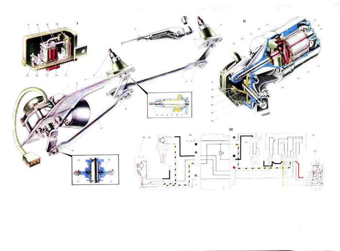1. Электродвигатель стеклоочистителя; 2. Скоба; 3. Внутренний уравнитель; 4. Ось рычага; 5. Рычаг щетки; 6. Наружный уравнитель; 7. Поводок правого рычага: 8. Промежуточная тяга; 9. Поводок левого рычага: 10. Втулки; 11. Штуцер; 12. Войлок; 13. Шатунная тяга; 14. Кривошип; 15. Вкладыши; 16. Распорная пружина; 17. Кожух реле; 18. Якорь реле; 19. Токопроводящая пластина: 20. Опора контактов; 21. Основание; 22. Обмотка реле; 23. Резистор; 24. Кронштейн прерывателя; 25. Биметаллическая пластина прерывателя; 26. Ось шестерни; 27. Шестерня редуктора; 28. Пружинная пластина; 29. Контактные стойки; 30. Смотри 29; 31. Крышка; 32. Вал якоря; 33. Крышка-картер редуктора; 34. Щетка; 35. Щеткодержатель; 36. Постоянный магнит; 37. Войлочное кольцо; 38. Подпятник; 39. Втулка; 40. Корпус; 41. Якорь электродвигателя; 42. Пластина крепления крышки; 43. Коллектор; 44. Электродвигатель стеклоочистителя: 45. Электродвигатель смывателя ветрового стекла; 46. Монтажный блок: 47. Выключатель зажигания; 48. Переключатель стеклоочистителя и омывателя ветрового стекла; 49. Реле стеклоочистителя: 50. 1.Реле РС-514 стеклоочистителя; 51. 11.Электродвигатель МЭ-241 стеклоочистителя; 52. III.Схема включения электродвигателей стеклоочистителя и смывателя ветрового стекла. |