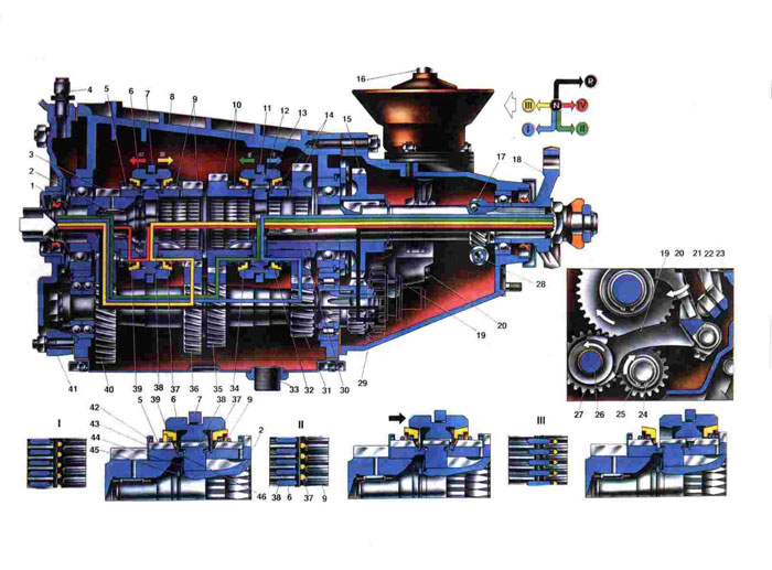 Принцип работы шестеренчатой коробки передач основан на изменении зацепления тех пар шесте- рен, которые участвуют в передаче крутящего мо- мента от первичного вала 1 на вторичный вал 2. Это достигается перемещением скользящих муфт 6 и 13 синхронизаторов или промежуточной шестерни 27 заднего хода при помощи рычага переключения передач. При этом изменяются передаточные числа шестерен, а значит и величина передаваемого крутящего момента. На прямой четвертой передаче крутящий момент, передаваемый на ведущие колеса автомобиля, практически равен крутящему моменту на коленчатом валу двигателя. На первой переда- че момент увеличивается в 3,75 раза, на второй в 2,30 раза, на третьей в 1,49 раза, а при включении задней передачи в 3,87 раза. При нейтральном положении рычага переключения пере- дач крутящий момент на вторичный вал не переда- ется. Но так как двигатель работает и сцепление включено, то вращение от первичного вала 1 пе- редается на промежуточный вал через шестерни 3 и 40 постоянного зацепления. От шестерен 31, 35 и 36 промежуточного вала вращение передается на шестерни 14, 10 и 9 вторичного вала. Так как эти шестерни с валом 2 непосредственно не свя- заны, то они будут свободно вращаться на вто- ричном валу. Соединение этих шестерен с валом 2 осуществляется через синхронизаторы. При вклю- чении первой передачи усилие от рычага переклю- чения передач через шток и вилку И передается на скользящую муфту 13. Перемещаясь по шлицам своей ступицы 12, муфта входит в зацепление с прямозубым венцом шестерни 14. Таким образом, муфта синхронизатора соединит между собой сту- пицу 12 и шестерню 14. А так как ступица 12 жестко связана с валом 2, то крутящий момент от шестерни 14 через муфту 13 передается на ступи- цу 12 и от нее на вторичный вал коробки пере- дач. При включении второй передачи муфта 13 со- единим ступицу 12 с прямозубым венцом шестерни 10, и крутящий момент передается от шестерни 10 на ступиц 12 и на вторичный вал. Третья и чет- вертая передачи включаются другим синхронизато- ром. При включении третьей передачи крутящий момент от первичного вала через шестерни 36 и 9 передается через муфту 6 на ступицу 38 и затем на вторичный вал. Четвертая передача называется прямой, так как крутящий момент передается не- посредственно с первичного вала 1 на вторичный вал 2, минуя шестерни промежуточного вала. В этом случае муфта 6 соединяет между собой зуб- чатый венец 5 первичного вала со ступицей 38. Частота вращения обоих валов будет одинаковой, а величина крутящего момента, передаваемого от двигателя на ведущие колеса, не изменится. При включении задней передачи усилие от рычага пе- реключения передач через шток 20 и вилку 19 пе- редается на промежуточную шестерню 27. Переме- щаясь на оси 26, она соединит между собой шестерни 25 и 15 заднего хода, и крутящий мо- мент передается от первичного вала через шес- терни 5 и 40 на промежуточный вал и далее через шестерни 25, 27 и 15 на вторичный вал. При этом последний будет вращаться в обратном направле- нии, обеспечивая обратное вращение ведущих ко- лес автомобиля. Как видно из схемы работы ко- робки передач, все передачи переднего хода синхронизированы. Принцип действия синхрониза- тора при включении третьей передачи показан на схемах 1, 11, III. При нейтральном положении рычага переключения передач (см. схему 1) между скользящей муфтой 6 и блокирующими кол
