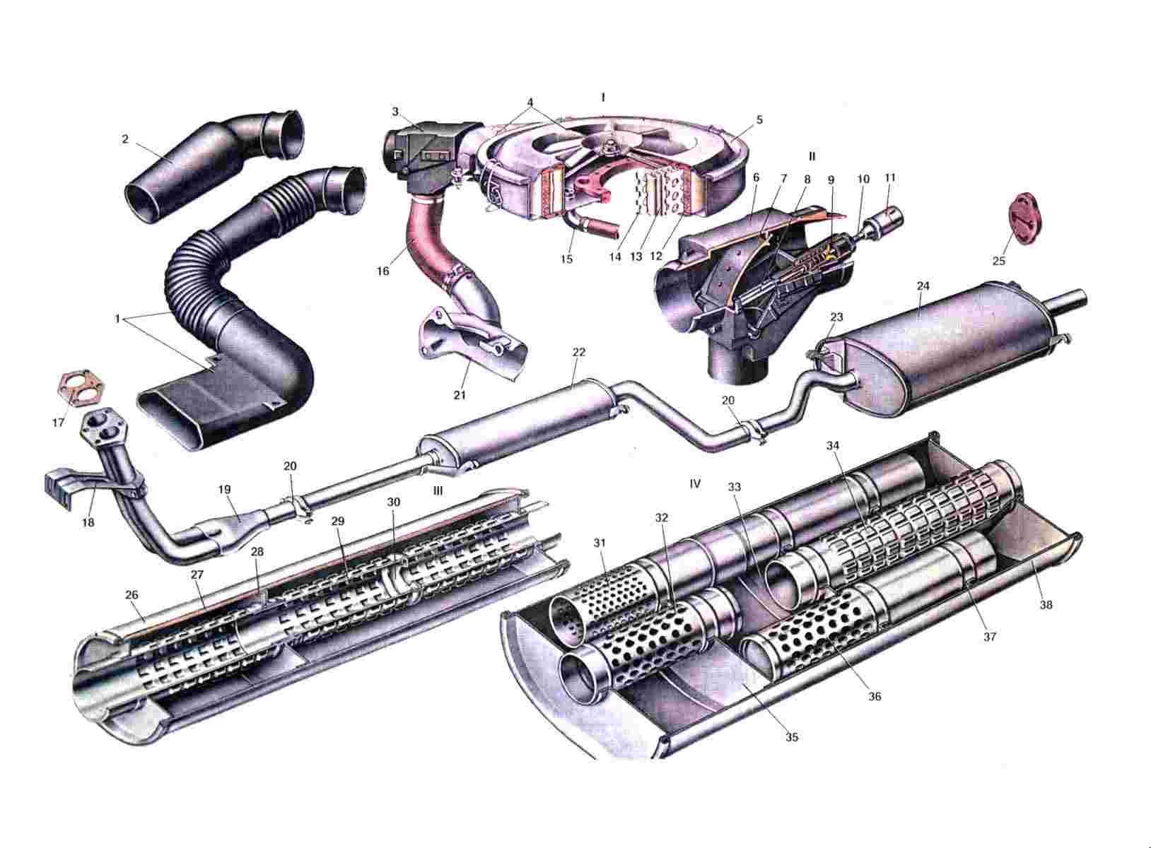 1. Воздухозаборник холодного воздуха с воздухопроводом автомобиля ВАЗ-2109; 2. Воздухозаборник холодного воздуха автомобиля ВАЗ-2108; 3. Терморегулятор; 4. Стрелки для установки крышки; 5. Крышка воздушного фильтра; 6. Корпус терморегулятора; 7. Заслонка терморегулятора; 8. Тяга; 9. Толкатель термосилового элемента; 10. Шток термосилового элемента; 11. Термосиловой элемент; 12. Предочиститель фильтрующего элемента; 13. Картонный фильтрующий элемент; 14. Перфорированная оболочка фильтрующего элемента; 15. Коллектор вытяжной вентиляции; 16. Гофрированный шланг; 17. Прокладка; 18. Кронштейн крепления приемной трубы: 19. Приемная труба; 20. Хомуты соединения труб; 21. Воздухозаборник теплого воздуха; 22. Дополнительный глушитель; 23. Крючок подвески глушителя; 24. Основной глушитель: 25. Подушка подвески глушителя: 26. Корпус дополнительного глушителя; 27. Теплоизоляция дополнительного глушителя: 28. Глухая перегородка; 29. Перфорированная труба: 30. Диафрагма; 31. Передняя перфорированная труба: 32. Впускной патрубок; 33. Средняя перегородка: 34. Выпускной патрубок: 35. Передняя перегородка: 36. Задняя перфорированная труба; 37. Задняя перегородка; 38. Корпус основного глушителя; 39. 1.Воздушный фильтр с терморегулятором; 40. 11.Терморегулятор; 41. III.Дополнительный глушитель; 42. IV.Основной глушитель. |