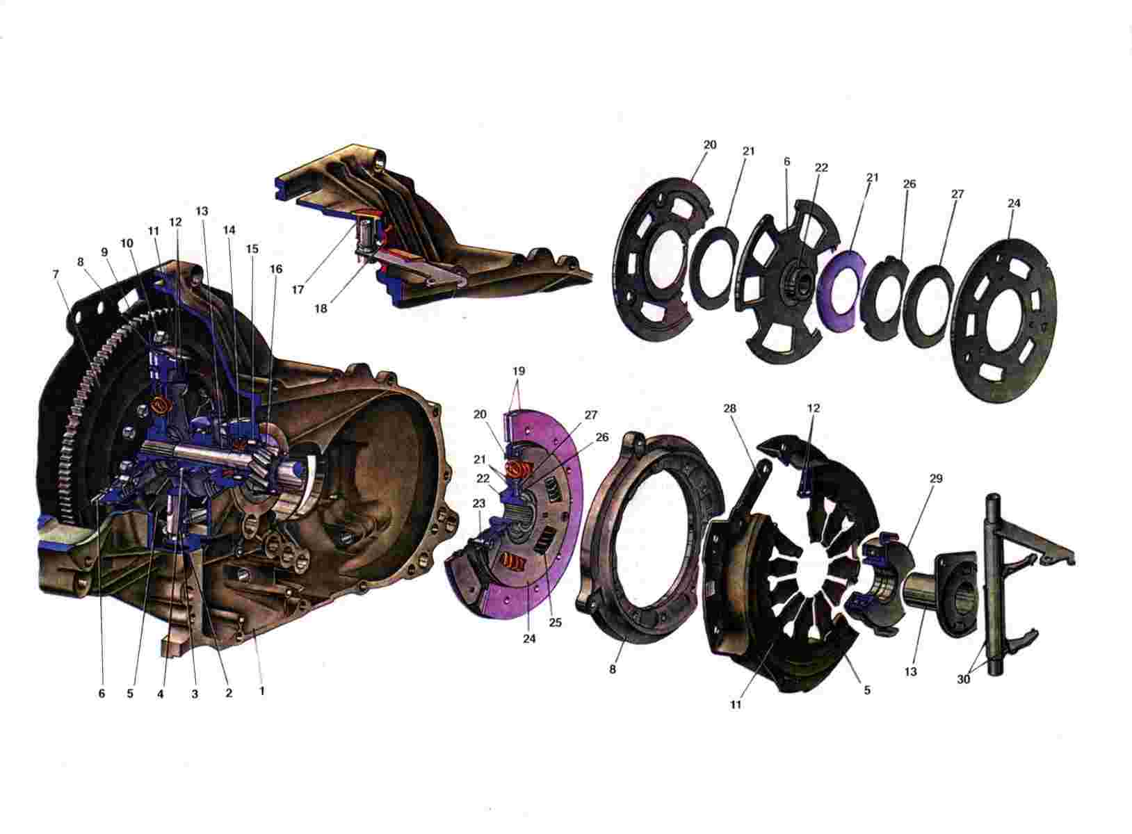 1. Картер сцепления; 2. Опорная втулка вала вилки выключения сцепления; 3. Вилка выключения сцепления; 4. Подшипник выключения сцепления; 5. Нажимная пружина; 6. Ведомый диск; 7. Маховик; 8. Нажимной диск; 9. Шкала для проверки момента зажигания; 10. Болт крепления сцепления к маховику; 11. Кожух сцепления; 12. Опорные кольца нажимной пружины; 13. Направляющая втулка муфты подшипника выключения сцепления; 14. Сальник первичного вала коробки передач; 15. Подшипник первичного вала; 16. Первичный вал; 17. Втулка вала вилки выключения сцепления; 18. Защитный чехол вилки выключения сцепления; 19. Фрикционные накладки ведомого диска; 20. Передняя пластина демпфера; 21. Фрикционные кольца демпфера; 22. Ступица ведомого диска; 23. Упор демпфера; 24. Задняя пластина демпфера; 25. Пружина демпфера; 26. Опорное кольцо пружинной шайбы; 27. Пружинная шайба демпфера; 28. Пластина, соединяющая кожух сцепления с нажимным диском; 29. Муфта подшипника выключения сцепления; 30. Соединительная пружина вилки и муфты подшипника выключения сцепления. |