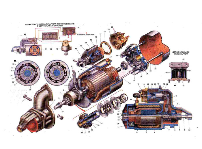 1. Oсь рычага. 2. Крышка со стороны привода. 3. Вал якоря. 4. Зубчатое колесо. 5. Привод. 6. Якорь электродвигателя. 7. Промежуточная опора. 8. Рычаг. 9. Корпус. 10. Обмотка возбуждения. 11. Полка. 12. Возвратная пружина. 13. Якорь тягового реле. 14. Обмотка втягивающая тягового реле. 15. Обмотка удерживающая тягового реле. 16, Корпус тягового реле. 17. Диск контактный. 18. Прокладка. 19. Крышка тягового реле. 20. Контактные болты. 21. Вывод. 22. Щетка. 23. Винт стяжной. 24. Колпак защитный. 25. Щеткодержатель. 26. Крышка со стороны коллектора. 27. Пружина щетки. 28. Коллектор 29. Втулка привода. 30. Кожух привода. 31. Толкатель. 32. Пружина ролика. 33. Подшипник зубчатого колеса. 34. Зубчатое колесо. 35. Упор якоря реле. 36. Подшипник вала якоря. 37. Запорное устройство вала якоря. 38. Пластина упорная. 39. Ролик. 40. Тяговое реле. 41. Реле дополнительное. 42. Выключатель зажигания. 43. Аккумуляторная батарея. 44. Стартер. 45. Пружина якоря дополнительного реле. 46. Якорь дополнительного реле. 47. Контакты. 48. Обмотка дополнительного реле. 49. Сердечник дополнительного реле. |